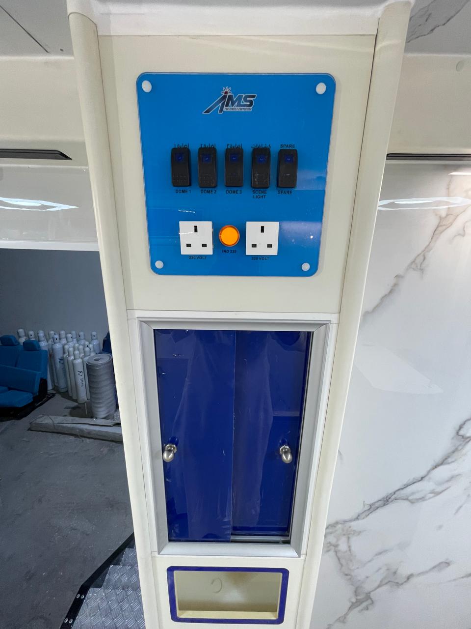 نظام كهرباء يعمل بشكل منفصل عن السيارة عبر مصدر خارجي أو مولد، باستخدام أسلاك سويدية وقواطع Schneider ألمانية داخل صندوق التحميل.